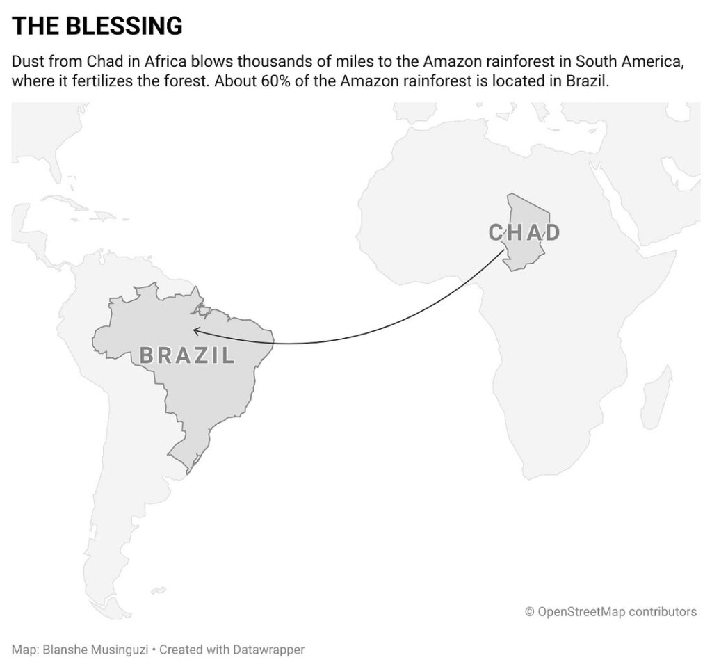 The Amazon’s soil is poor in phosphorus because heavy rains wash it away. But each year, the Sahara delivers about 22,000 tons of phosphorus, helping the rainforest stay healthy and productive.