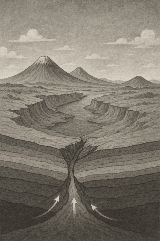 But then, about 20 million years ago, things shifted. Instead of volcanoes depending mainly on that deep heat, the land itself began to play the leading role. As the African continent stretched apart, the crust cracked like a breaking loaf of bread. Those cracks gave magma easy escape routes to the surface. In other words, the tearing of the land above became just as important as the heat from below.