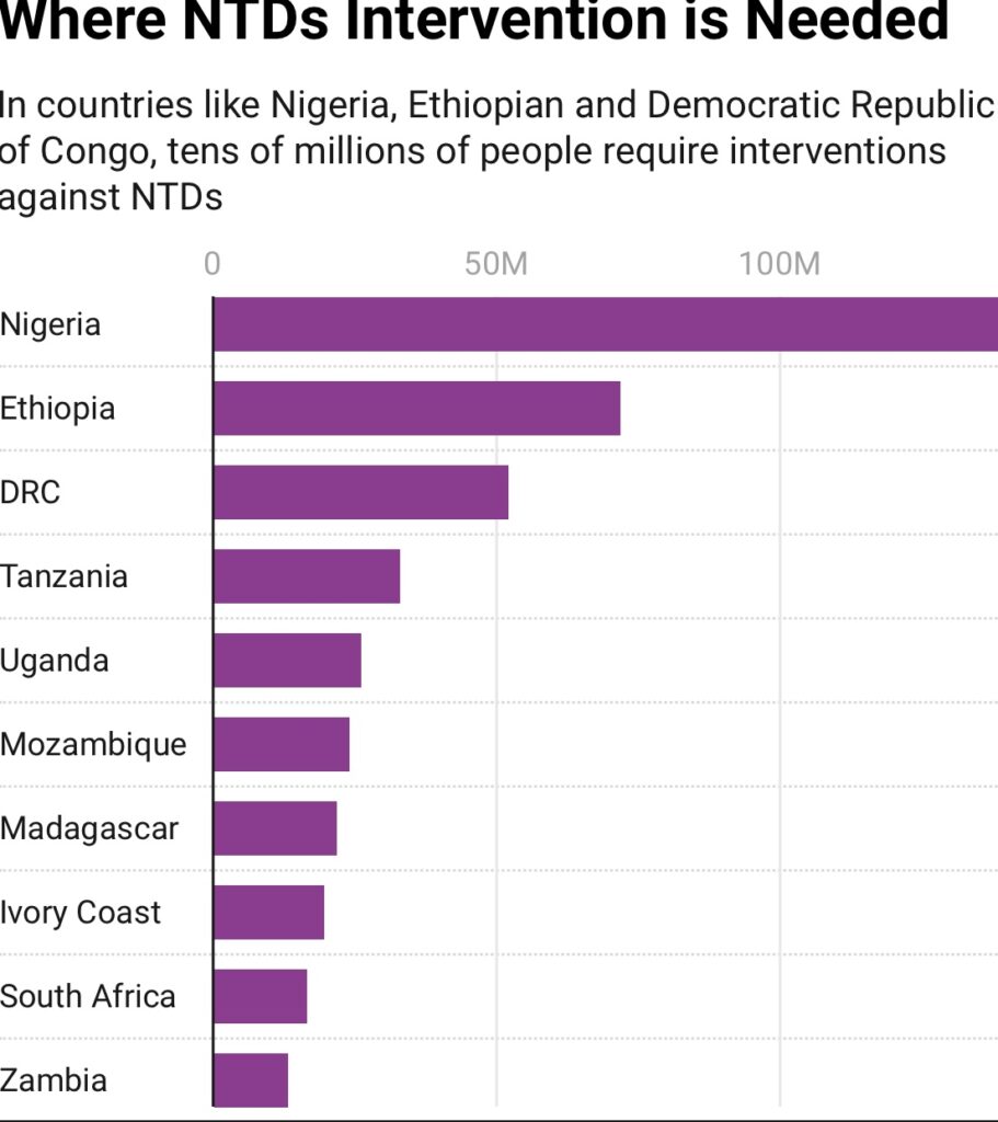 More than one billion people worldwide are affected, with Africa carrying approximately 40% of this burden. The World Health Organization (WHO) estimates that 600 million people in Africa require treatment for at least one NTD. In many countries across the continent, five or more NTDs are found in the same areas, compounding the problem.